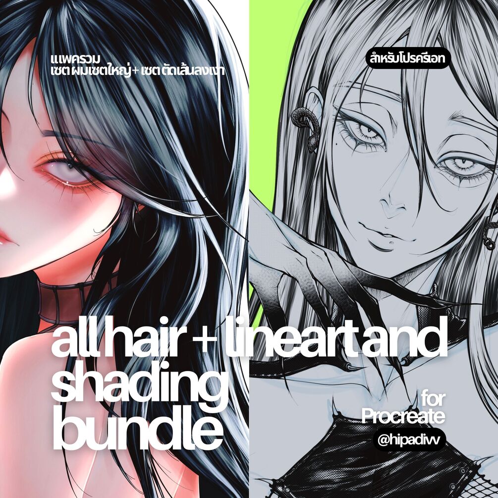 (Commercial Usage Included) hipadivv All Hair + Lineart and Shading Bundle Set for Procreate